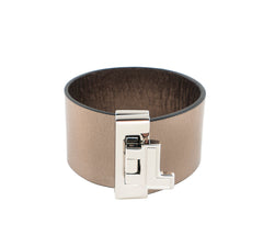 - LIA Spring Hinge Bracelet bronze leather and palladium finish metal.